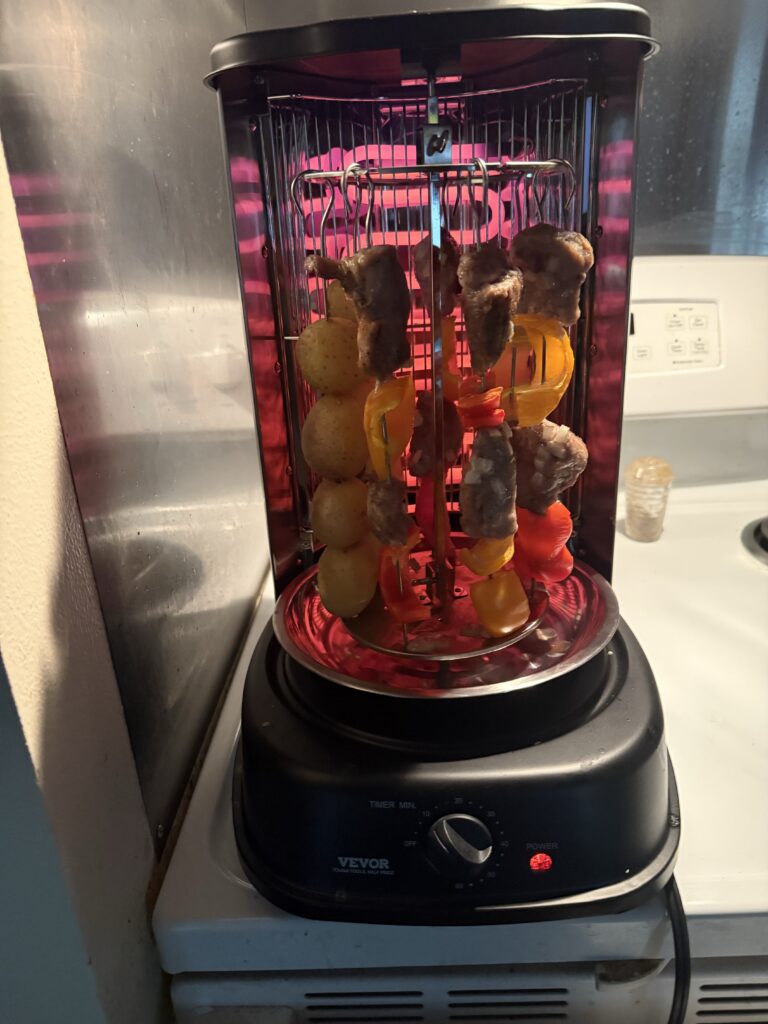 After rides I may eat heavier especially in the evening with lean-meat kebabs, for example, from our new rotisserie carousel for protein.